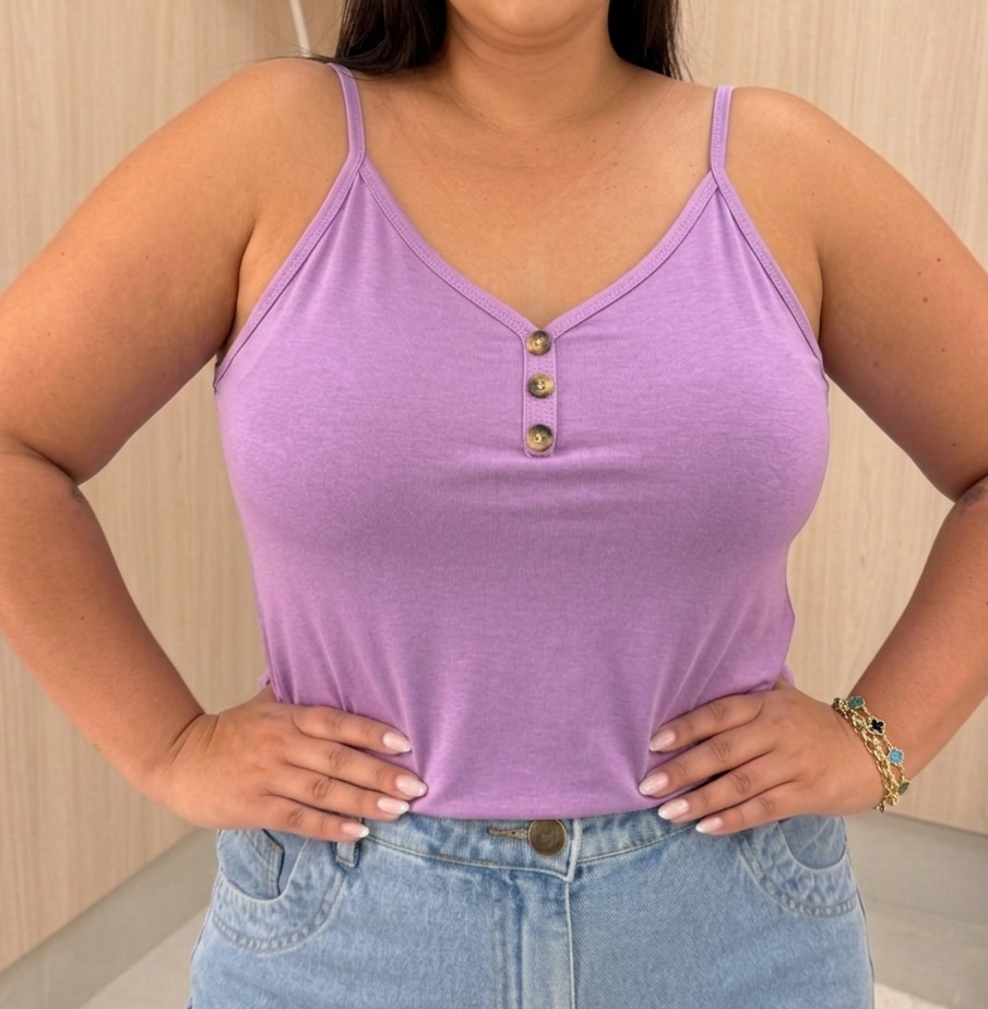 - Detalhe: Decote em V com botões frontais decorativos, que dão charme à peça