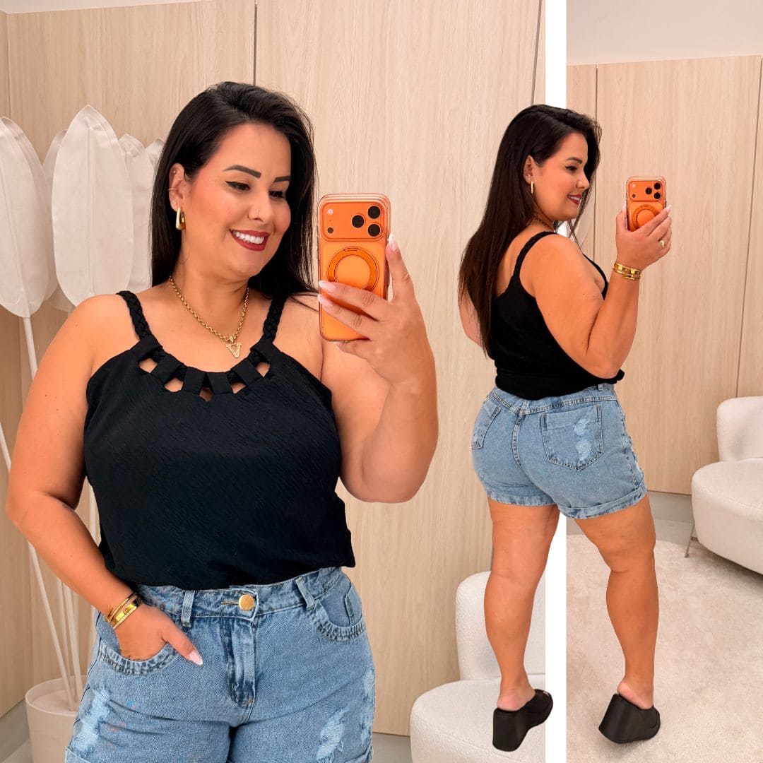 Blusa Alça Duna Trançada Jaque Preta Plus Size