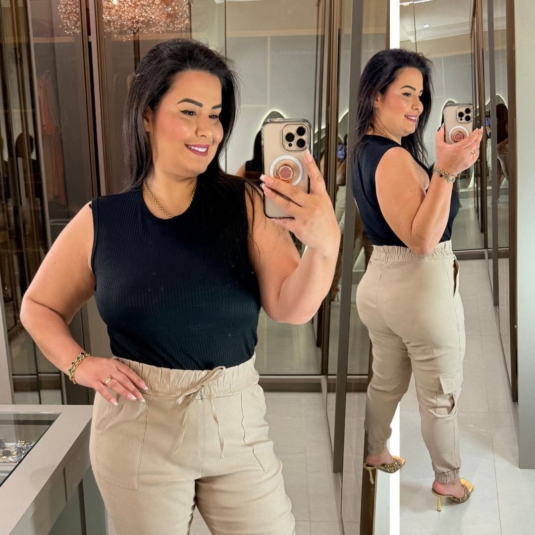 - Tecido Canelado: Elastano na composição, oferecendo excelente elasticidade e conforto