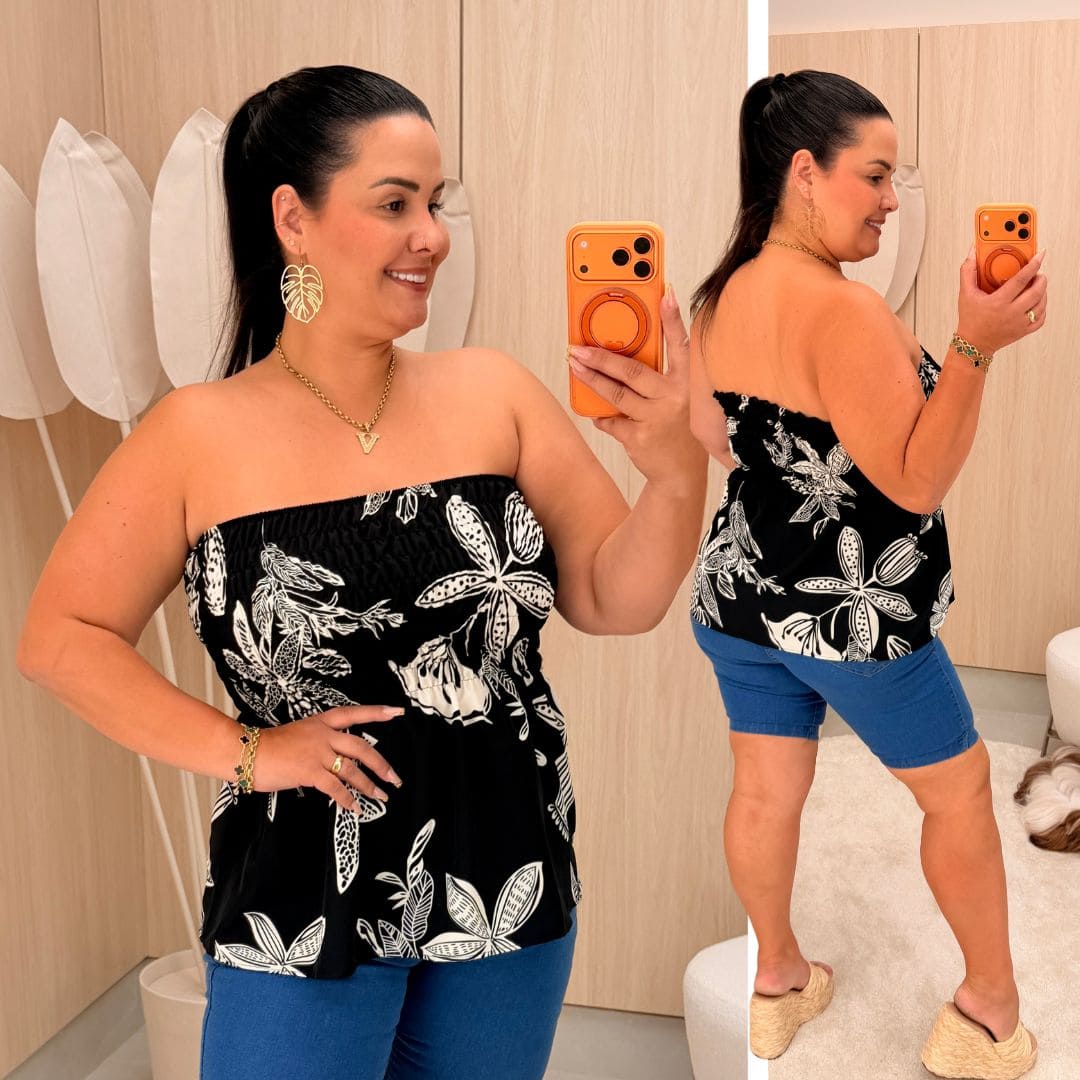 Blusa Elastex Sofia Preto Estampado Plus Size