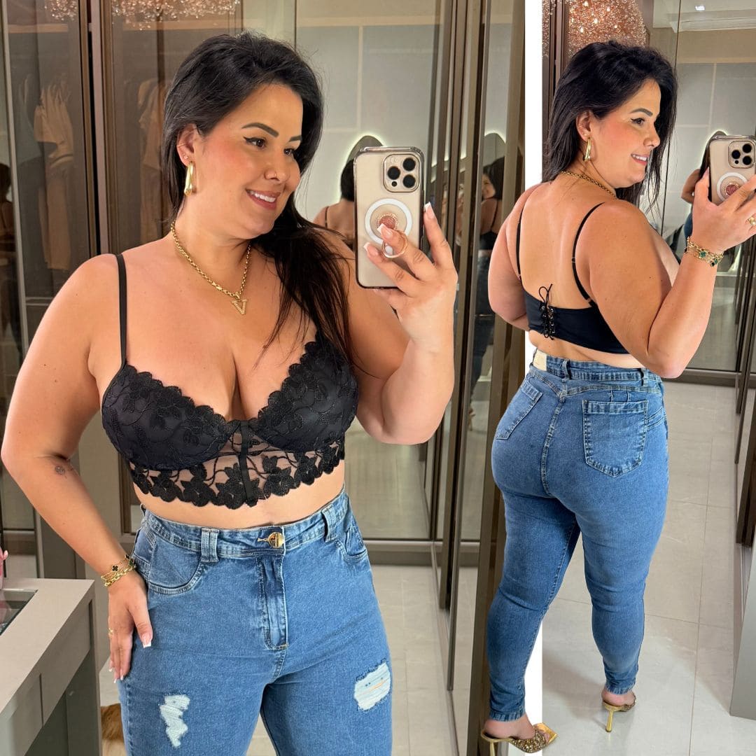 Cropped Bordado Renda Preto Plus Size