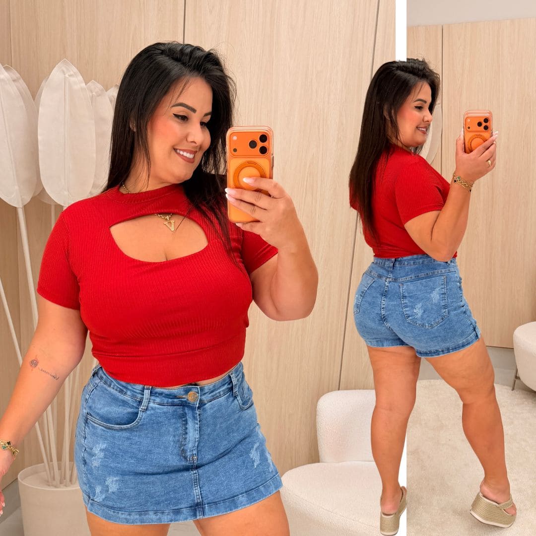 - Decote: Diferenciado com recorte frontal vazado, moderno e estiloso