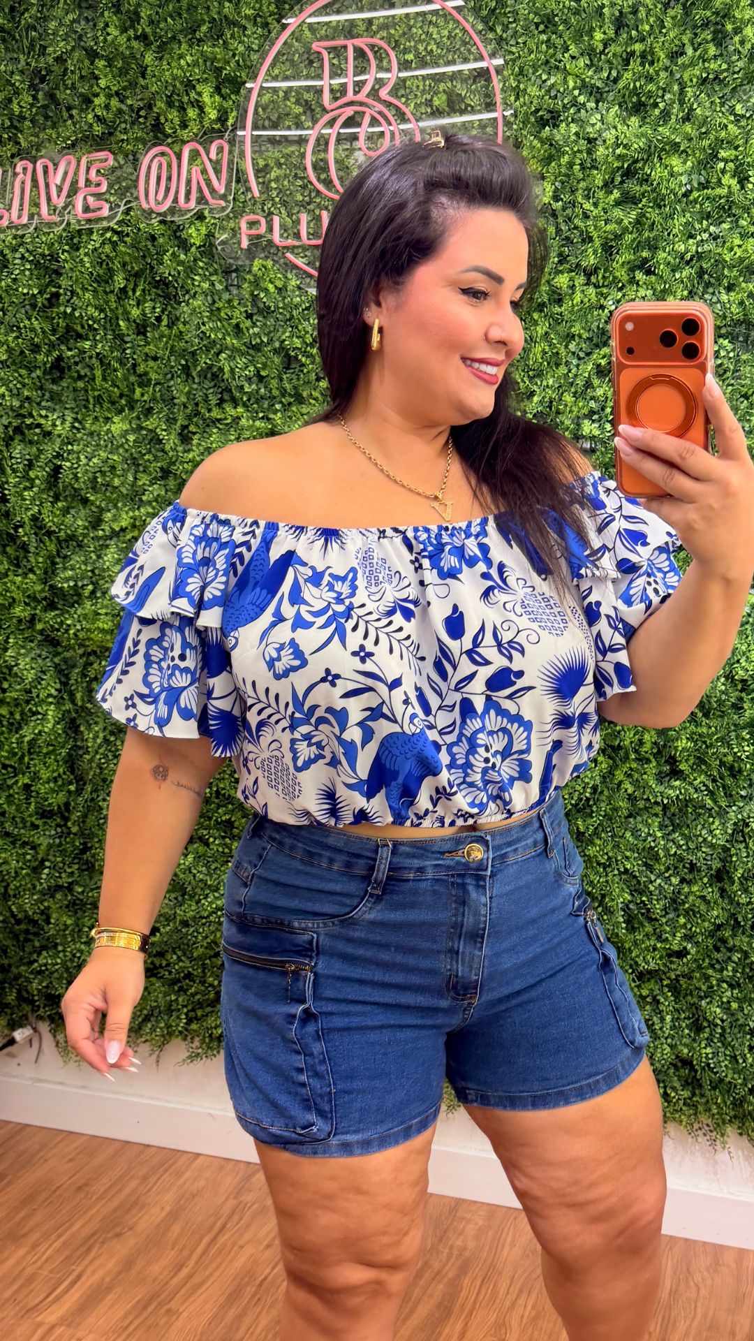 Cropped Ciganinha Vip Estampado Azul e Branco Plus Size