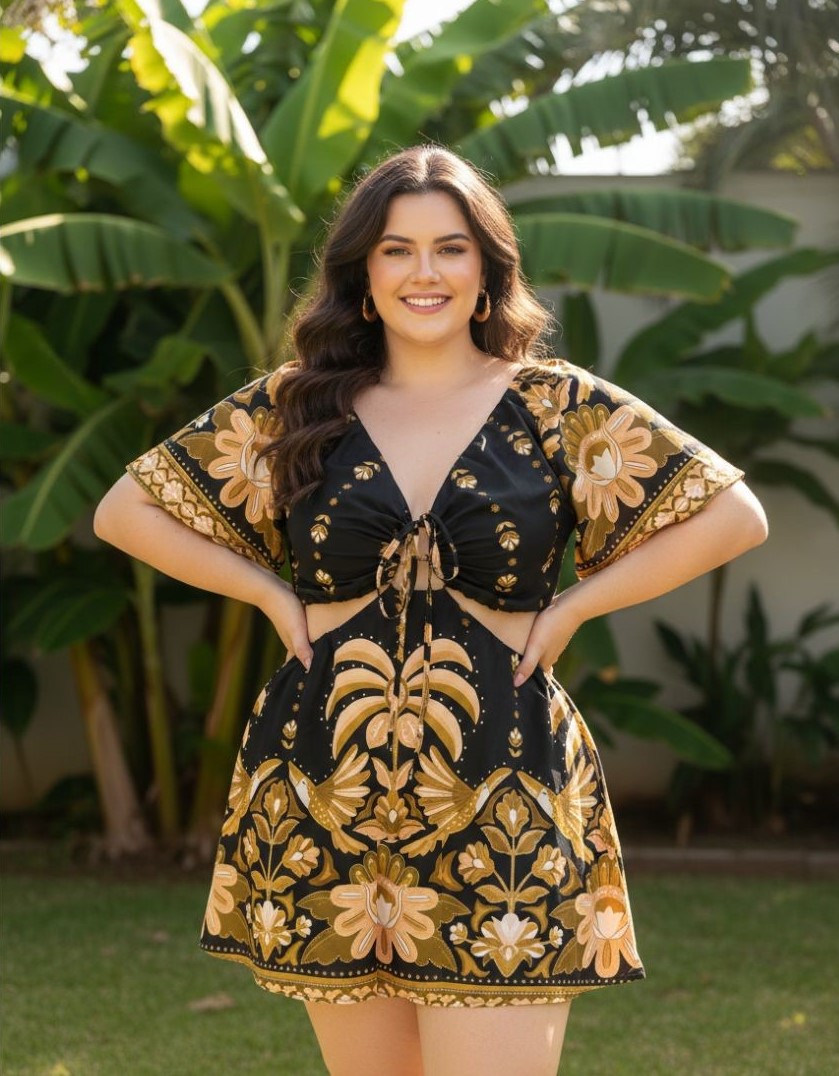 - Detalhe frontal: Amarração no busto com recorte na cintura, trazendo charme e sensualidade