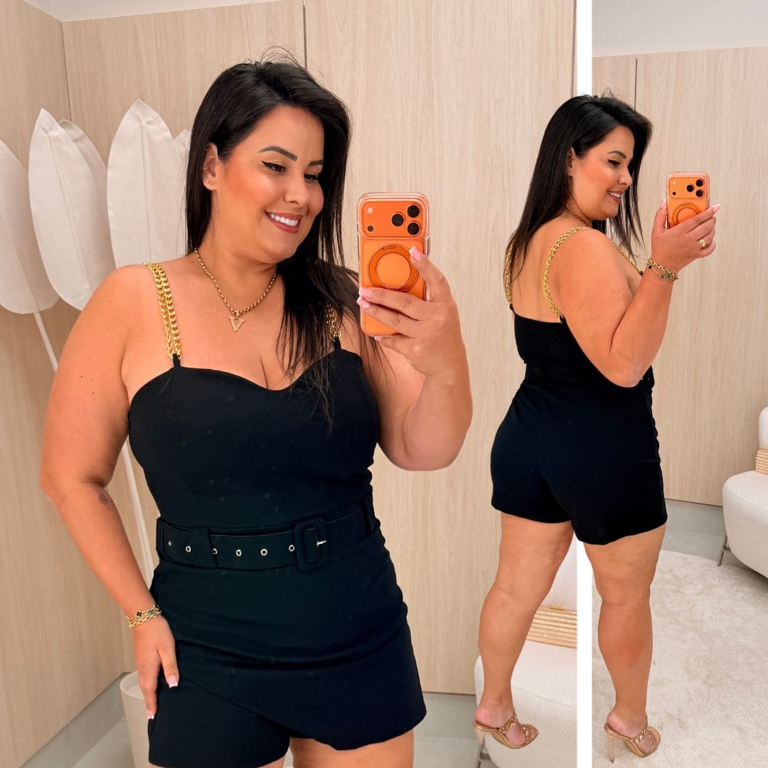 - Alças: Finas com detalhe em corrente dourada, trazendo sofisticação ao look