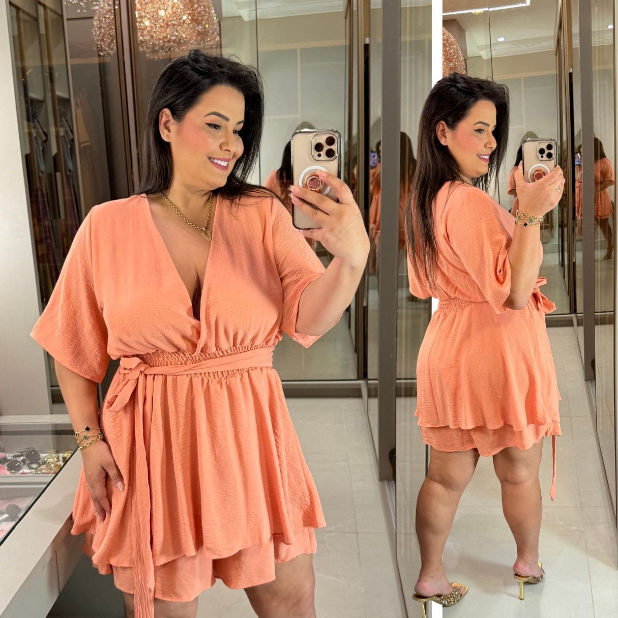 Macaquinho Manga Cindy Pêssego Plus Size