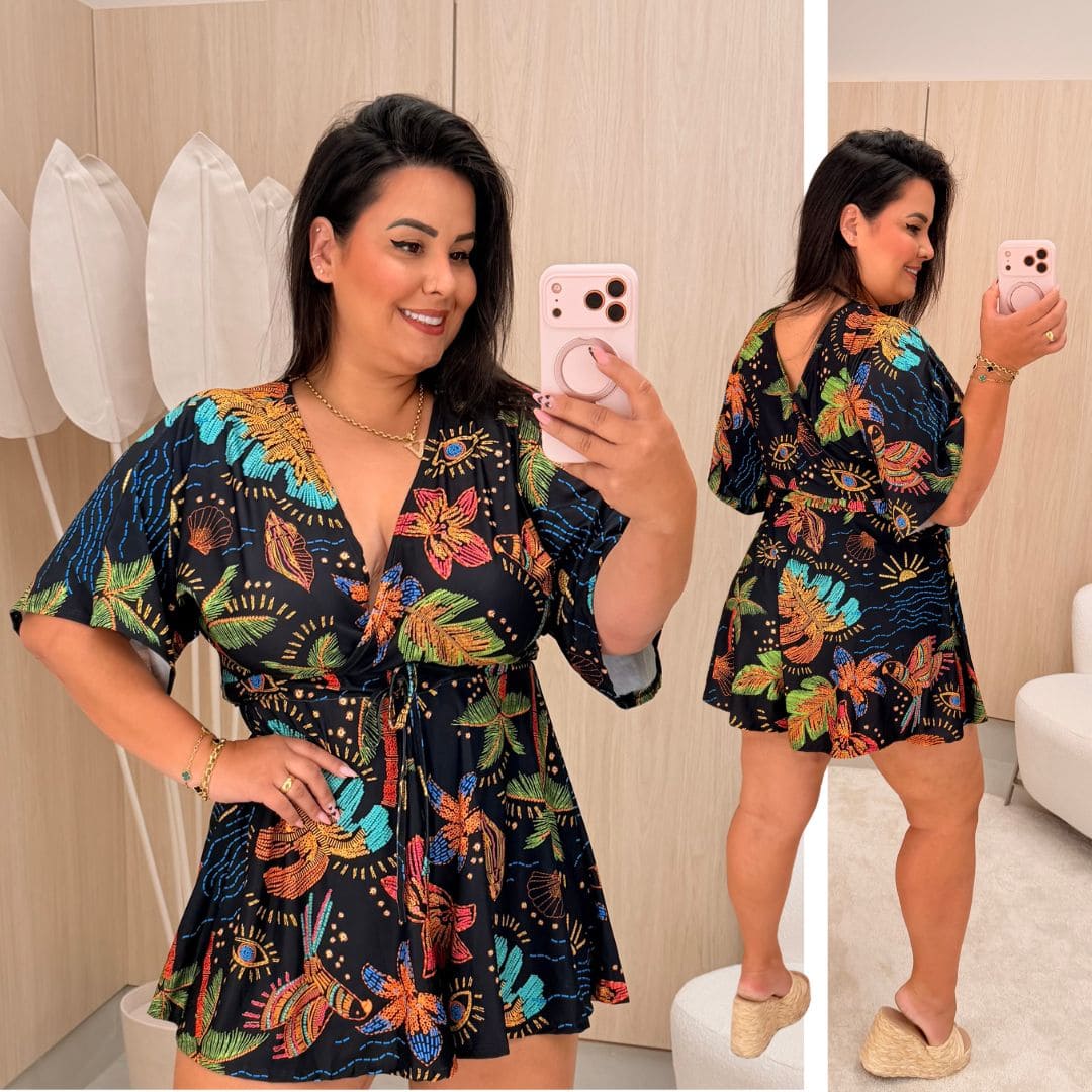 Macaquinho Nina Verão Preto e Verde Plus Size