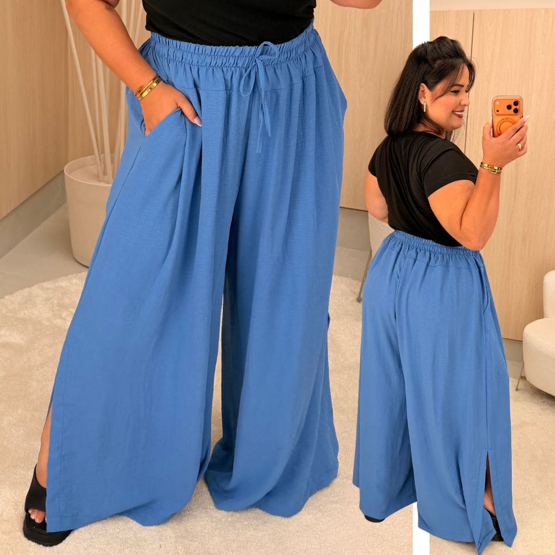 Calça Pantalona Cós Duplo Azul Jeans Plus Size