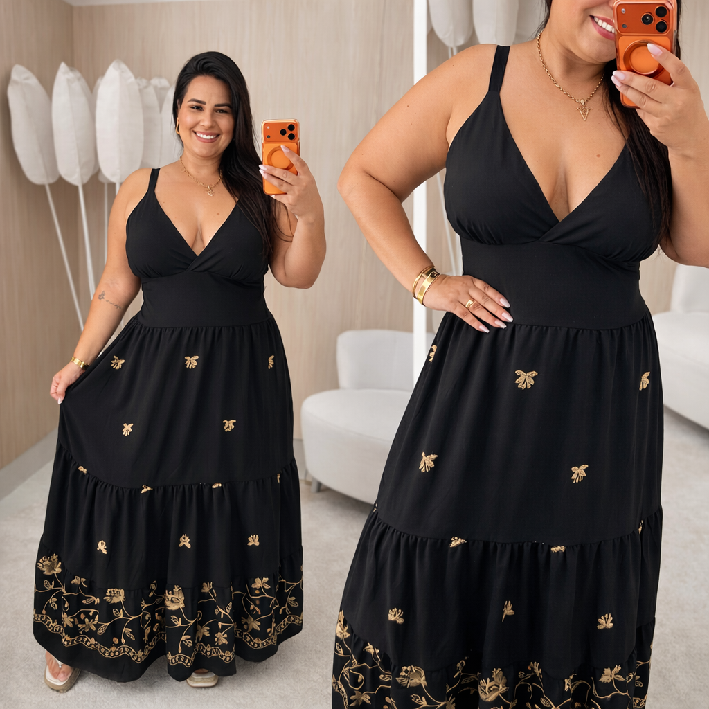 Vestido Alça Farm Bordado Preto Flor Plus Size