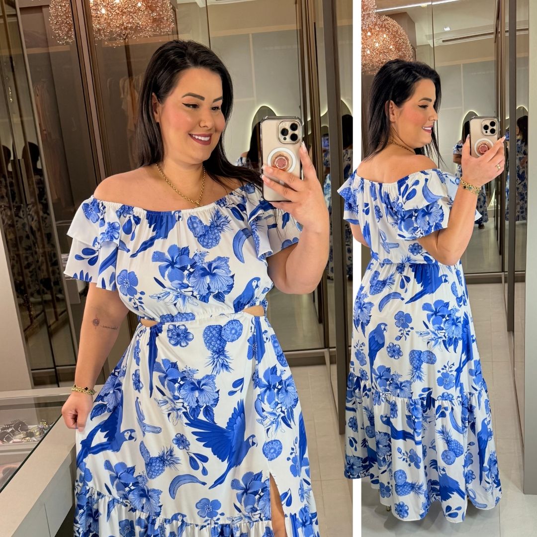 Vestido Anastasia Ciganinha Tropical Azul Plus Size