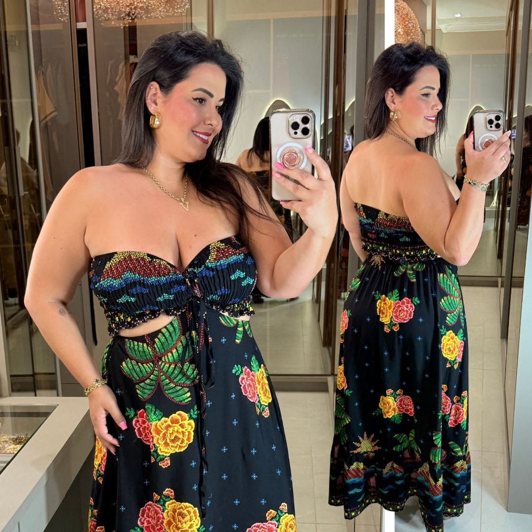 - Design: Modelo tomara que caia, com amarração com ajuste sutil no pescoço, valorizando o colo