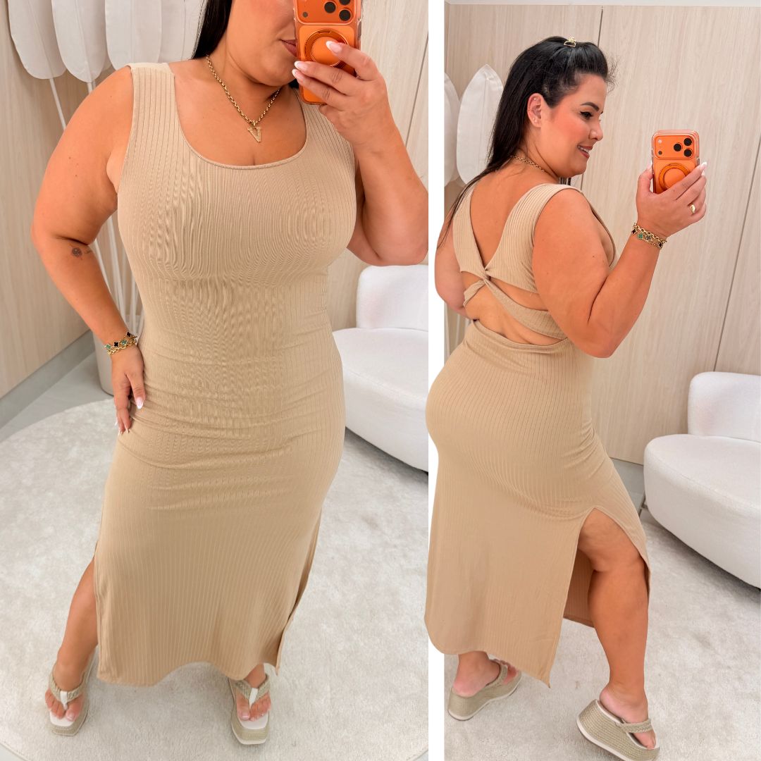 Vestido Mid Canelado Grazi Bege Plus Size