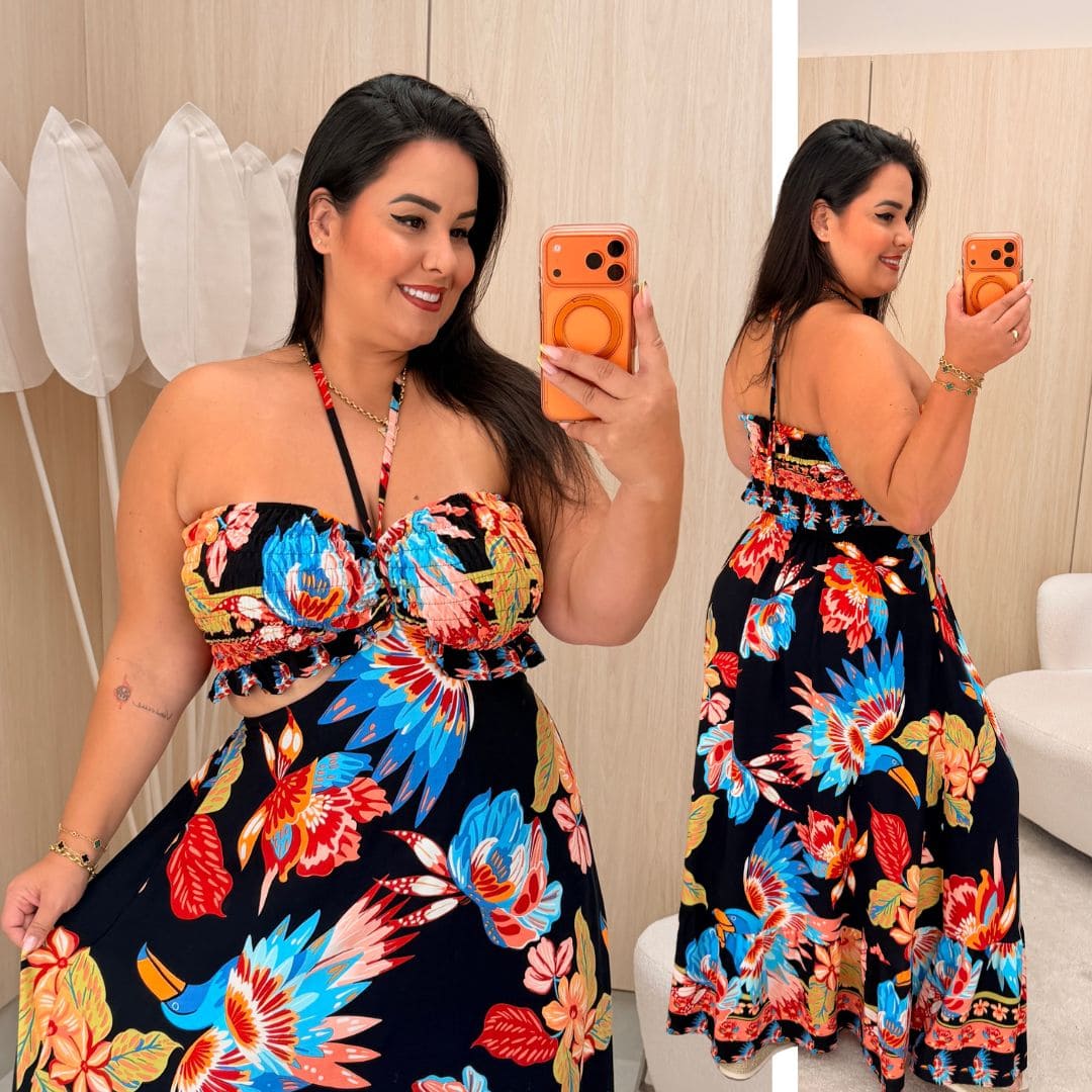 Vestido Multi Formas Estampado Preto Floral Plus Size