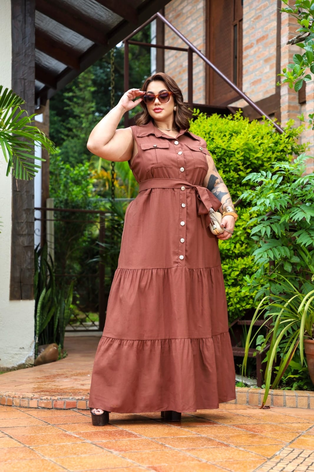 Vestido Nanda Botão Marrom Plus Size